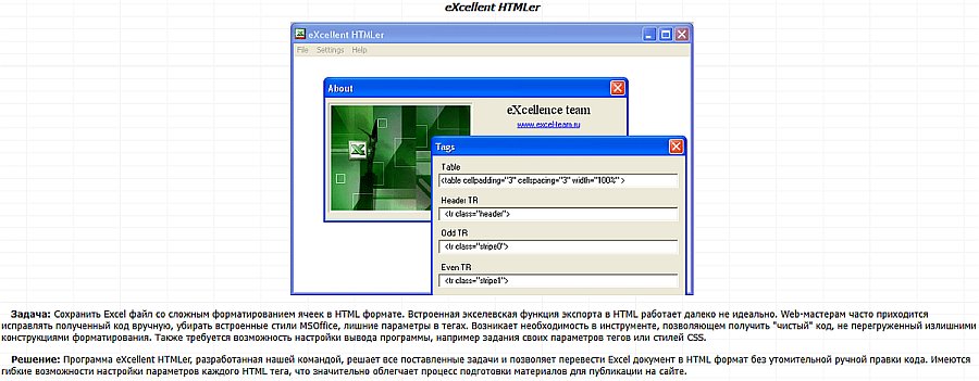 Самый простой способ конвертировать Excel таблицу в HTML - это воспользоваться программой eXcellent HTMLer.